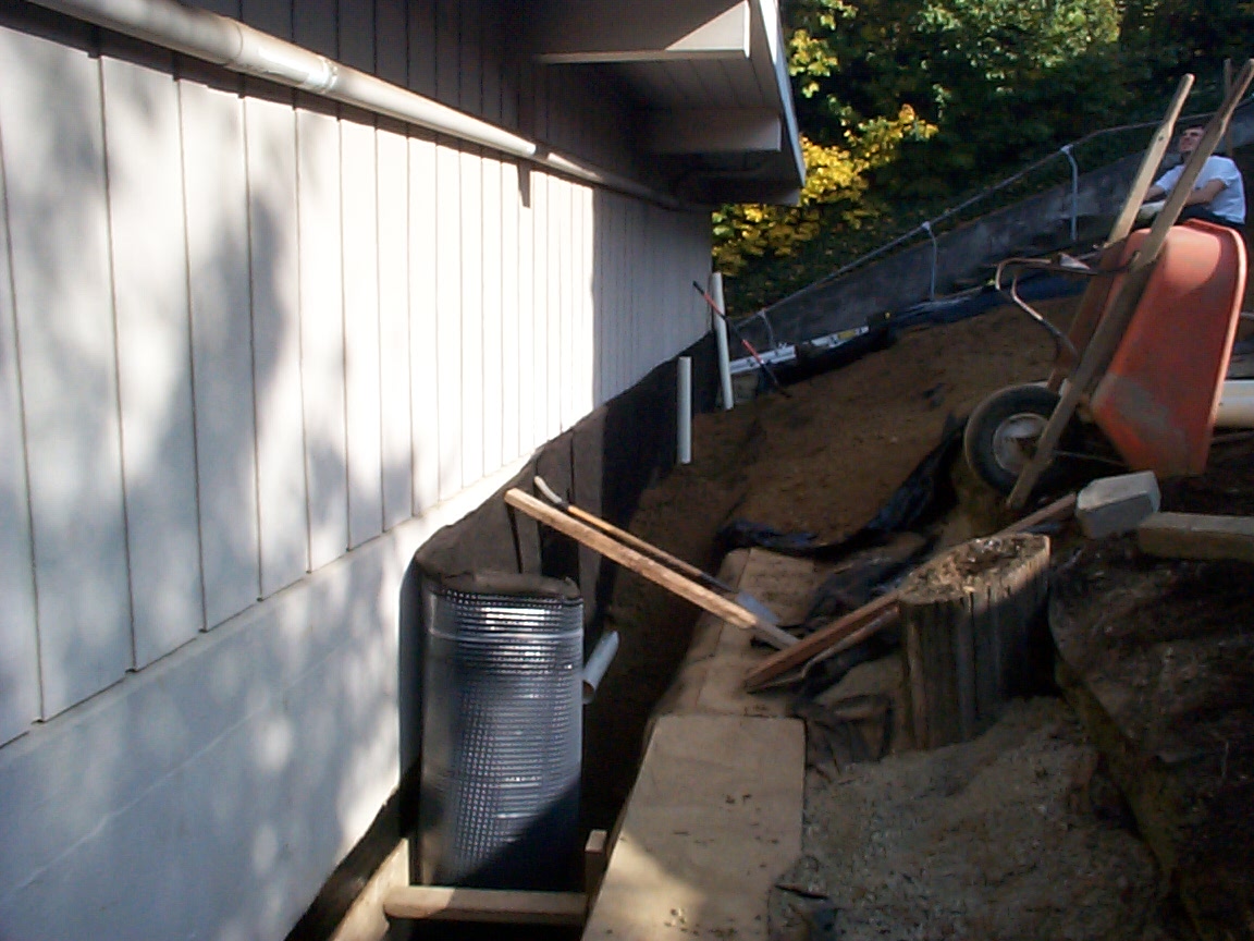 Some homes were built without footing drains or the drains are so badly deteriorated that they must be replaced. Generally this is accomplished by excavating a trench around the house to a depth below the elevation of the footings. The foundation wall is then cleaned and sealed with a waterproof coating. A perforated drainpipe is installed on the grade to slope towards the final outlet, and covered with drain rock.