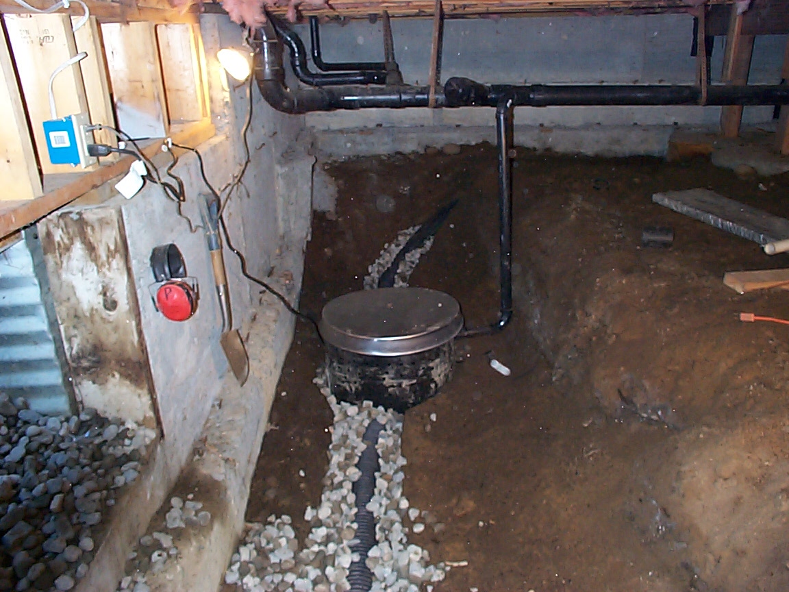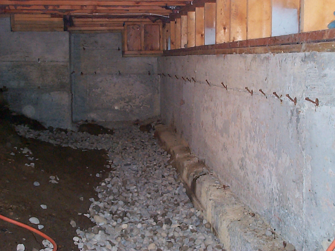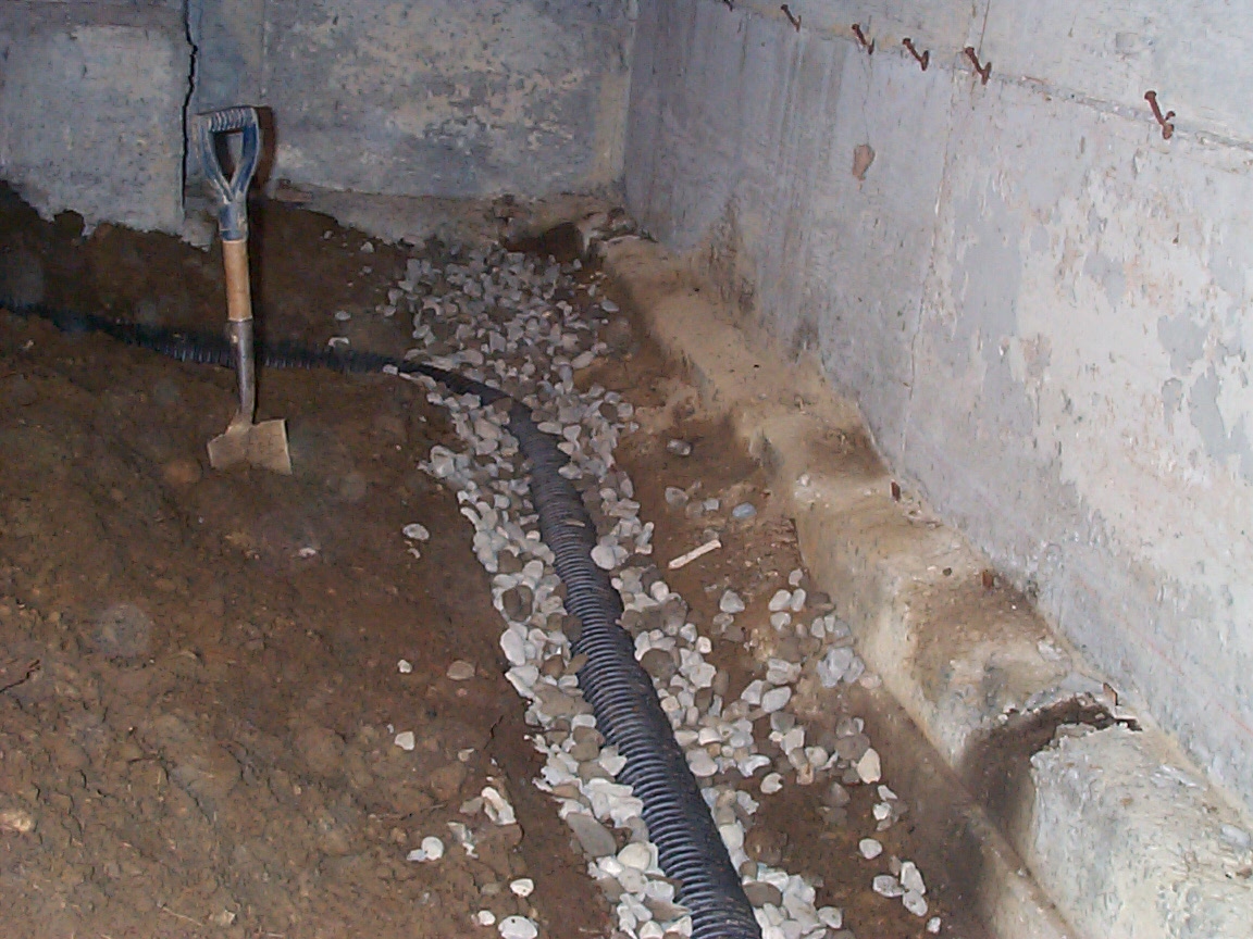 Typical interior foundation footing drains involve excavating a shallow trench around the inside of your foundation below the footing elevation and sloping it to the lowest level of the crawl space. Perforated pipe is installed in the trench and surrounded with drain rock. The piping is connected to a catch basin (drain) installed at the lowest point of the crawl space. Depending upon the topography, the collected water is drained out by gravity or is mechanically pumped to the appropriate outlet source like a storm drain system.